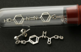 硝酸や塩酸といった単純な化学式から、解熱剤などに用いられるアセトアミノフェン、アミノ酸のひとつのトリプトファンといった複雑な構造式まで扱い、オーダーも受ける。理系の学生や理系出身者では、「左耳にトルエン、右耳に硝酸で、反応させると爆薬といった組み合わせを楽しんでいる」(浜田さん)つわものも多いそうだ。