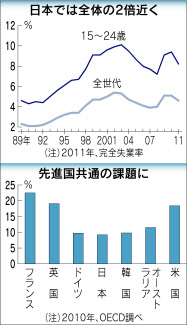 ▽…若者が職に就けなかったり、低賃金にとどまったりすると、国の財政や成長の基盤も揺らぐ。若年失業率が27.9%に達するイタリアでは、モンティ首相が企業の解雇条件を緩和する労働市場改革に乗り出した。日本では、大学にハローワークの窓口を設けるなどの「若者雇用戦略」を6月にまとめる方向だが、大胆な制度改革に踏み切る機運はなく、抜本的な解決につなげるのは難しい情勢だ。