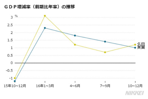 同時に発表した16年暦年のGDPは実質で前年比1.0%増、生活実感に近い名目で1.3%増となった。