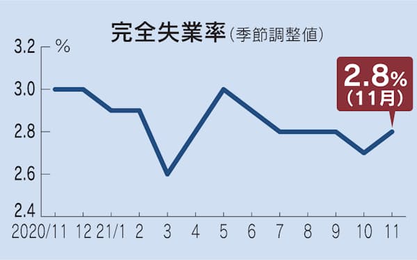 完全失業率を男女別でみると、男性が3.4%と前の月に比べて0.2ポイント上昇した。女性は横ばいの2.7%だった。