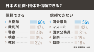 8つの機関や団体、公職を挙げてそれぞれの信頼度を尋ねたところ「信頼できる」が最も高かったのは自衛隊で60%に上った。5割を超えたのは自衛隊のみで、次いで信頼度が高かったのは裁判所(47%)、警察(43%)、検察(39%)、教師(32%)の順で、司法・捜査当局への信頼が高かった。これらはいずれも「信頼できる」が「信頼できない」を上回った。