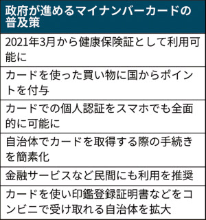 政府は4日、首相官邸でデジタル・ガバメント閣僚会議を開き、マイナンバーカードの普及に向けた総合的な対策を決めた。2021年3月から健康保険証として使えるようにし、22年度中に全国のほぼすべての医療機関が対応するようシステムの整備を支援する。21年分の確定申告からはカードを使って簡単に医療費控除の手続きもできるようにする。