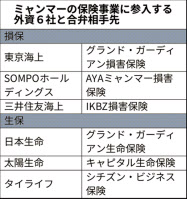 合弁による保険参入を巡っては、ミャンマー政府が4月に関心表明を募った時点では生損保9社が意向表明書を提出していたが、このうち生保1社、損保2社は合弁相手との交渉が折り合わず、参入にこぎ着けることができなかった。