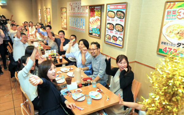 ラーメン店「日高屋」は10月1日に日付が変わると同時に、肉を増量するなどリニューアルしたギョーザを振る舞うイベントを東京都中央区の店舗で実施した。ギョーザは9月まで税込み230円で販売していたが、増税後も値段を据え置き、実質値下げとなる。10月末までは170円で販売し、増税後の消費の冷え込みを抑える。イベントに来た都内の外資系企業で働く女性(35)は「増税後も(ギョーザの)値段が変わらないので来店したくなる」と話した。