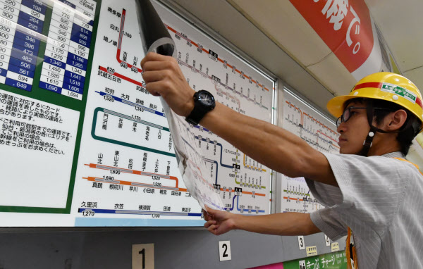 JR新宿駅南口では1日の終電後、午前1時20分から運賃表の張り替え作業を始めた。事前に運賃表のパネル自体は10%の価格のものに変えてあり、パネルの上に貼っていた8%の運賃表のシールをはがすだけで作業は済んだ。1日の始発から10%の運賃が適用される。新宿駅では計9カ所について13人体制で始発までに作業を終える予定だ。