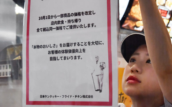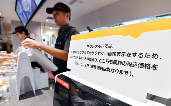 24時間営業の「マクドナルド西新宿店」(東京・新宿)では、1日午前5時の朝食メニュー投入時に税率を切り替え、レジの前にも一斉に告知文を掲示した。1時間で十数人の来店客があったものの、大きな混乱はなく、会計は通常通りスムーズに進んだ。日本マクドナルドでは、税率の異なる店内、持ち帰りでも税込み価格を同額になるように本体価格を調整している。「ケンタッキーフライドチキン(KFC)」も店内飲食も持ち帰りでも税込み価格をそろえる対応をとった。主力商品は税込み価格を据え置き、一部メニューの価格を10~20円引き上げている。東京ドームシティラクーア(東京・文京)内にある店舗では午前10時の開店に向け朝から準備に追われ、カウンターの上にあるメニューボードや店内ポスターを新メニューに入れ替えた。