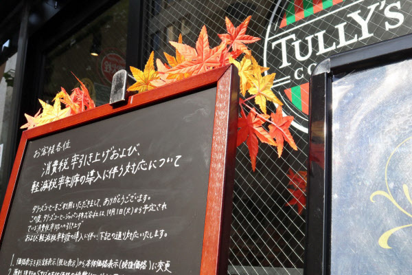 カフェチェーン運営のタリーズコーヒージャパンは10月1日から店内飲食は10%、持ち帰りは8%の税率で商品の提供を始めた。東京都中央区のタリーズコーヒーの店舗では「イートインを普段利用する常連客で、きょうから持ち帰りに切り替えた利用者はいなかった」(同社の前田暁人ディストリクトマネジャー)という。持ち帰りを利用したエネルギー関連会社に勤務する女性(35)は「軽減税率の対象かどうかは特に気にしていない」と話した。店内を利用したコンサルタントの男性(46)は「特に(テークアウトとの)2%の差は大きいとは感じない。混乱もしなかった」と話した。