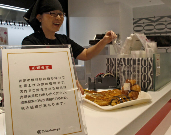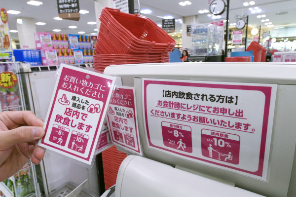 東京都中央区の高島屋日本橋店では1日、食料品売り場のイートインで、持ち帰りと店内飲食で価格が異なることを掲示した。会計の際に、来店客に持ち帰りか店内飲食かを確認するようにした。イートインを利用した東京都文京区に住む主婦(68)は、「価格をみて2%あがったと気付いたが、数十円なので気にならない。これからも店内で食べたいときには利用する」と話していた。