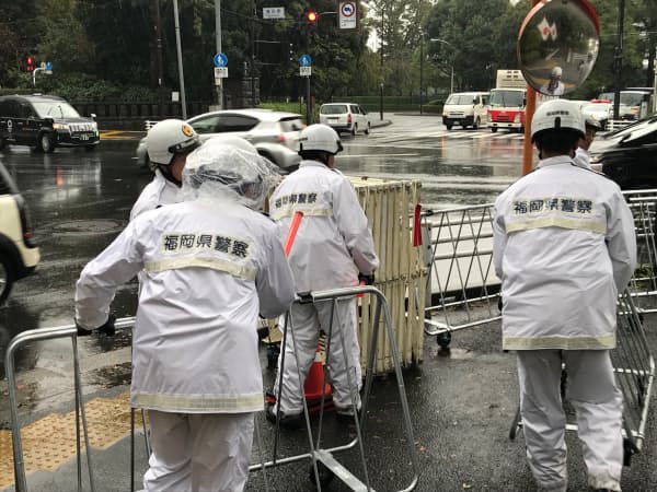 午前8時25分、天皇、皇后両陛下が皇居に向かわれた後の赤坂御所周辺は、応援に駆けつけた福岡県警の警察官らが交通整理にあたっていた。この日は台風19号の被災地を除く各地から応援の警察官が動員され、最大で約2万6千人規模となる。
