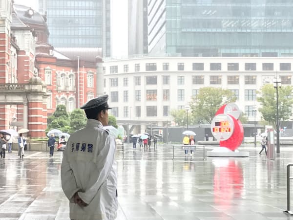 午前8時20分ごろ、東京駅から皇居へ向かう行幸通りでは交通規制に当たる警視庁の警察官らが雨の中、準備に追われていた。都心では皇居周辺の一般道や、高速道路が規制の対象となる。