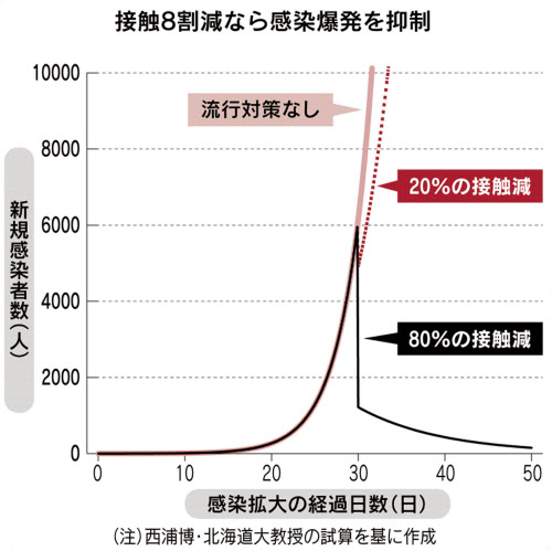 一方、8割程度減らすことができれば、潜伏期間などを踏まえ、10日~2週間後に1日数千人をピークに急激に減少させることができるとしている。西浦教授は「現在の東京都は爆発的で指数関数的な増殖期に入った可能性がある」とみており、「早急に自粛より強い外出制限をする必要がある」と求めている。