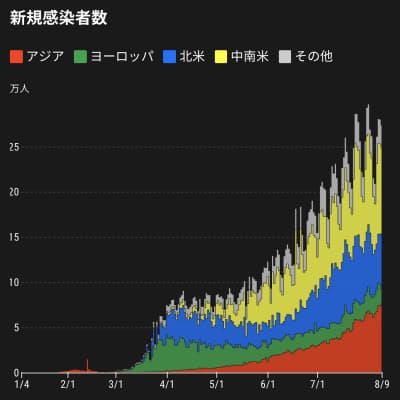 【世界全体の新規感染者】1日あたりに確認された新規感染者数は一貫して増加する傾向にある。7日移動平均で計算すると、5月末に10万人を超え、7月11日から20万人を上回る。いまは25万人台の水準で推移する。足元の新規感染者を地域別で分析すると、中南米が最も多く、アジア、北米が続く。