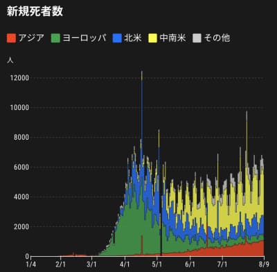 【世界全体の新規死者数】1日あたりの死者数を見てみる。7日移動平均で4月19日に7293人でピークに達した後、減っていたが、6月から徐々に増えて、足元では5800人を超える水準になっている。地域別では中南米が最も多い。