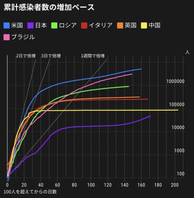 【国別の累計感染者数の増加ペース】国別の累積感染者の増加ペースを見てみる。チャートの横軸は累計感染者が100人を超えてからの日数を、縦軸は累計感染者数を示す。縦軸は100、1000、10000と数が10倍ずつ増える対数目盛りにした。傾きが増加のペースで、垂直になるほど増加は速く、水平に近づくほど遅い。米国は57日目、ブラジルは98日目で1万倍の100万人に到達した。中国が感染者が多く増えずに水平になっている一方、米国やブラジル、日本は右上がりの形になっている。