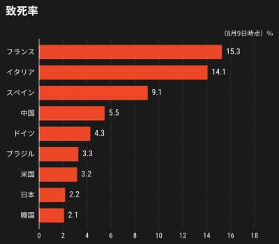 【主要国の致死率】致死率は感染者のうち亡くなった人の割合を指す。数値が高いのは欧州で、フランスやイタリアは10%を超える。感染者の急増で医療現場が対応できず、死者が出るケースが目立つ。日本は6月以降に死者の増加ペースが鈍り、直近は2.2%になっている。各国の検査方針で感染者数が左右されるため、致死率が実態を完全に表しているわけではない。