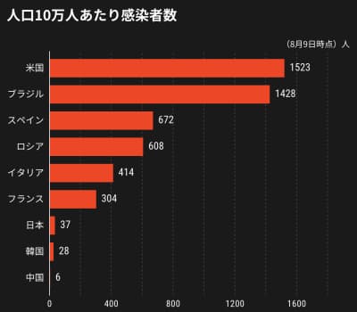 【人口10万人あたり感染者数】人口10万人あたりの感染者数を見てみる。8月9日時点で米国は1523人で、66人に1人が感染した計算になる。ブラジルの上昇ペースも速く、1400人を超えた。日本は37人で、韓国を上回る。