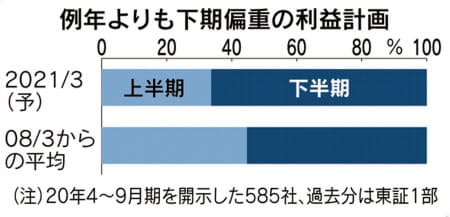 上期と通期の両方の業績予想を開示した585社で集計するとその傾向が鮮明だ。純利益は上期に前年同期比54%減となるのに対し、下期は19%増える見込み。例年の利益の内訳は下期が55%の割合だが、今期は下期が65%だ。もっとも全体の売り上げ計画では、上期(24%減)に続き下期も2%減る見通し。下期の増益はコスト削減によるところも大きそうだ。