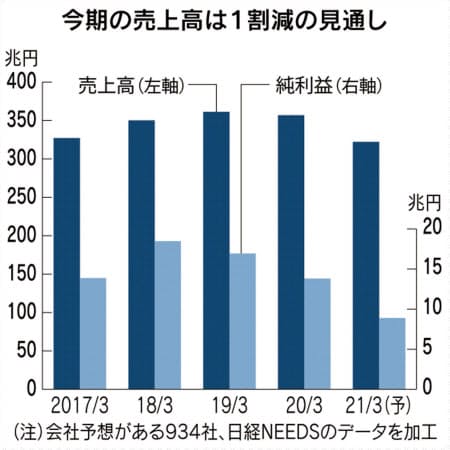 7日時点で今期予想を開示した企業は全体の66%になった。利益の合計額は業績がピークだった18年3月期比で半減し、1ドル=80円前後の円高に苦しんだ13年3月期と同水準となる。売上高も前期比1割減の見込み。減収幅は上場企業全体が11%減だった10年3月期以来となり、企業は多くの製品やサービスの需要低迷に直面している。