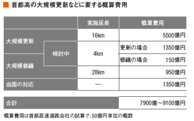 もちろん、同社が7900億~9100億円と試算した更新・修繕費をどう捻出するのかという問題は残る。同社や国交省などは、既存路線の掘割区間を人工地盤で覆い、その上の土地の容積率を「空中権」として民間企業に売る手法などを検討しているが、料金の値上げや償還期間の延長などを含めて、現時点で具体的な解決策を見出せていない(注:首都高速道路会社は2013年12月25日、約6300億円を投じる首都高の更新計画を発表)。
