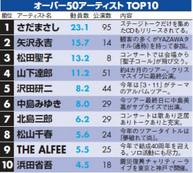 50歳以上のアーティストを対象にした、オーバー50動員ランキングで1位に輝いたのはさだまさし。23万人を動員する予定だ。長年の努力が実り、7月17日の武道館公演で通算公演数4000回という偉業も達成する。