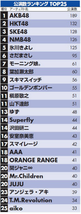 一方、公演数ランキングでは、AKB48が189回で1位となった。公演数2位には、先の総選挙で1位に輝いた指原莉乃率いるHKT48。以下SKE48、NMB48と続いた。