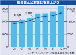 事実、2012年は動員数で3000万人を突破し、公演数でも2万回を超えている(下のグラフ参照)。CDが売れないと叫ばれる昨今において、コンサート産業は確実に大きくなっている模様だ。