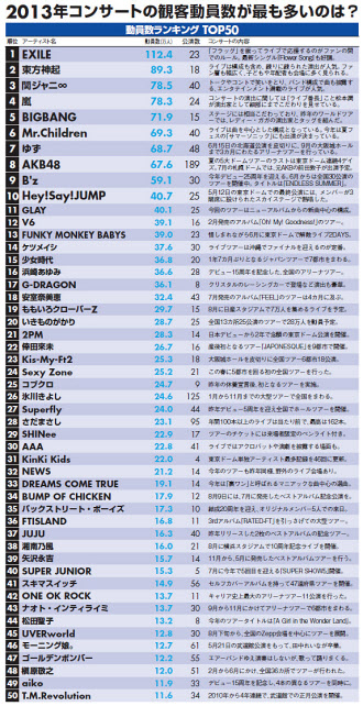 エンタでは、2013年1月から6月中旬までに開催されたライブと、それ以降、6月中旬の時点で年末までのスケジュールが発表されているライブの会場規模を集計し(6月中旬以降に発表された公演は含まない)、アーティスト別の年間ライブ動員数を独自に算出(調査基準は下囲みを参照)、上位50組をランキングした。
