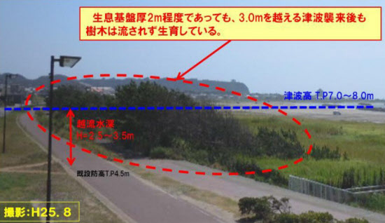 震災では、堤防の背後にある樹林が津波の波力を減衰させて破壊力を弱めたことが確認されている。そこで、海岸法の海岸保全施設の定義に、堤防や突堤、護岸、胸壁、離岸堤、砂浜などのほか、堤防と一体的に設置した根固めや樹林を盛り込んだ。