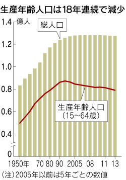 生産年齢人口は前年より116万5千人減の7901万人で、総人口に占める割合は62.1%。81年以来、8千万人を割り込んだ。95年をピークに減少傾向を続けており、2012年以降は1947~49年生まれの「団塊の世代」が65歳以上の高齢者層に入り始め、傾向に拍車をかけている。