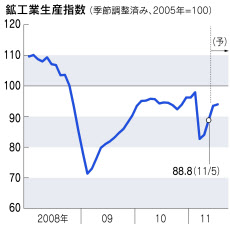 11業種が上昇した一方、鉄鋼業など5業種は低下した。鉄鋼業は国内や韓国向けにH形鋼などが伸び悩み2.2%低下。液晶テレビやパソコン向けが低調だった電子部品・デバイス工業は0.6%下がった。
