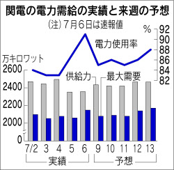関西電力などによる節電要請開始から1週間が過ぎた。気温がそれほど高くなかったことなどから需要は先週段階の週間予想を大きく下回った。電力の使用率が6日に一時90%を超え、需給が「やや厳しい」ことを示す"黄信号"が今夏初めてともったが、一部の火力発電所を計画的に止めた上でのこと。実際の供給力には今のところ余裕があり、当面は安定した需給状況が続きそうだ。
