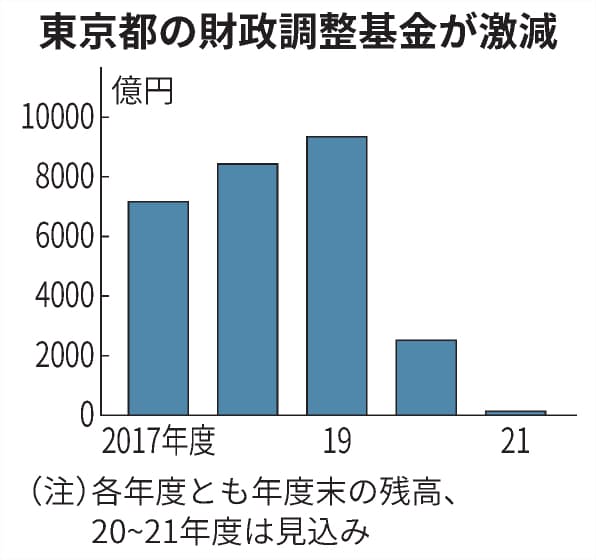 都の財政調整基金の残高は20年度末で2511億円を見込む。相次ぐ新型コロナ対策で基金を取り崩す結果、21年度末は21億円になる見通しで、台所事情は厳しくなっている。