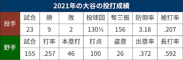 今季は打者で打率2割5分7厘、リーグ3位の46本塁打、100打点、26盗塁の好成績を残した。投手でも9勝2敗、防御率3.18、156奪三振。安打数、打点、得点、投球回数、奪三振の投打5部門で100以上をマークする大リーグ史上初の選手となり、スケールの大きさを示した。