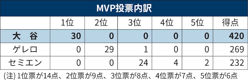 MVPはレギュラーシーズンの成績を対象に、プレーオフ前に実施される全米野球記者協会会員30人の投票で決まる。大谷選手は48本で本塁打王のゲレロ(ブルージェイズ)、45本塁打のセミエン(同)の両選手とともにア・リーグMVPの最終候補3人に順当に残り、満票での選出がなるかに注目が集まっていた。