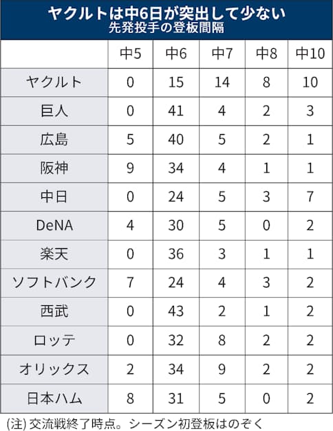 中6日の代わりに、中7日は14回、中8日は8回に上り、中10日も10回ある。ベテラン石川雅規はほとんどが中10日以上、エース格の小川泰弘や若い高橋奎二でも基本は中7日以上という「ゆとり運用」になっている。
