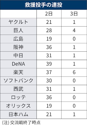 先発の負荷が少なければ、しわ寄せは当然リリーフにいくはずだ。しかしヤクルト首脳陣は、特定の投手に負荷が偏らないよう、ここでも巧みに差配している。交流戦までの62試合消化時点で連投は22回しかない。それも21回は2日の連投で、3連投は1回だけとコンディションに配慮している。内訳をみると、登板数、投球回を多くの投手がバランス良く担う形になっており、6月に入ると無失点のまま交流戦を駆け抜けた。高津臣吾監督が交流戦のMVPを「リリーフみんな」と言ったのもうなずける。