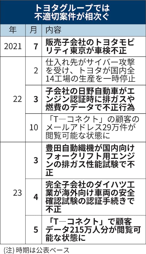 トヨタグループでは不正も相次いで発覚している。完全子会社のダイハツ工業は4月、試験認証手続きでの不正を発表した。豊田自動織機でも主力のフォークリフト向けのエンジンについて、排ガスデータを差し替えるなどの行為が3月に判明した。日野自動車でも22年以降、トラックのエンジン排ガスのデータ不正が問題となった。