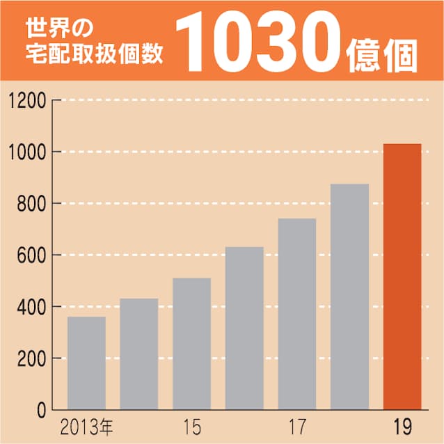 米郵便計器大手のピツニーボウズによると、19年の世界の宅配取扱個数は前年比18%増の1030億個となり、初めて1000億個の大台を上回った。ネット通販市場の拡大によって26年には最大2620億個に達する見通しだ。荷物の急増でドライバーなど宅配業者の労働環境が悪化し、米国ではクリスマスシーズンの遅配が常態化。日本でもヤマトホールディングスが当日配送の見直しや値上げに踏み切るなど、世界で「宅配危機」を引き起こした。