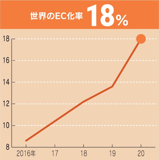 米調査会社のイーマーケッターによると世界の小売業全体のEC化率は20年に18%となり、前年に比べ4.4ポイント上昇した。新型コロナウイルスに伴う「巣ごもり消費」が追い風となった。ベゾス氏が自らの発明品の一つとする外部企業も出品可能なアマゾンのECプラットフォーム「マーケットプレイス」は、実店舗からウェブサイトへと世界の人々の購買行動を変えた。