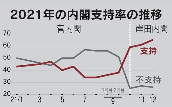 岸田文雄首相は2022年1月4日に就任3カ月を迎える。日本経済新聞社の12月の世論調査で内閣支持率は65%と10月から6ポイント上昇した。過去四半世紀の政権をみると8割近くは最初の3カ月間で支持率が落ちた。上がったのは小泉純一郎政権、第2次安倍晋三政権に続く3例目だ。