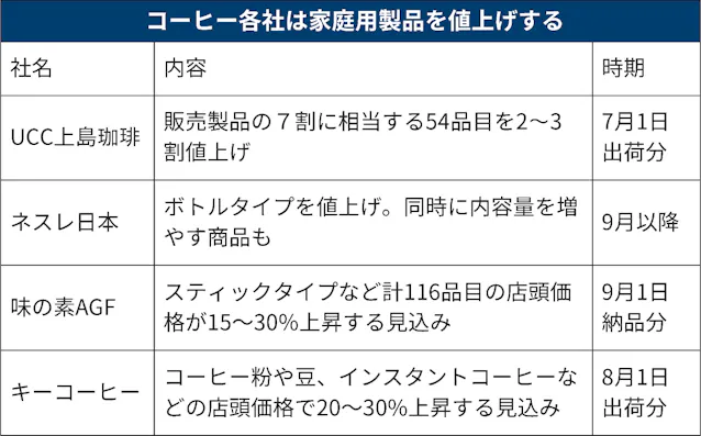 UCC上島珈琲(神戸市)の値上げは7月だ。値上げ率は2〜3割で、家庭用レギュラーコーヒー製品での対象商品数は54品目と販売製品の7割に達する。ボトルや業務用のレギュラーコーヒーの価格も順次見直す。キーコーヒーは8月、家庭用コーヒー製品を約2年ぶりに値上げする。店頭価格は20〜30%上昇する見込みで、全国に45店舗あるキーコーヒーの直営店での価格も順次引き上げる。