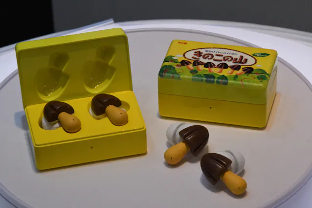 明治、「きのこの山」を模したワイヤレスイヤホン初公開