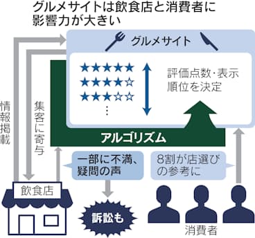 カカクコムによると、食べログは2022年時点で掲載店舗数が約82万店で、サイトの月間利用者数は8700万人を超える。公正取引委員会の20年の調査では、消費者の約83%が点数を参考に飲食店選びをしており、店側にとって食べログの評価点が客足に与える影響は大きい。