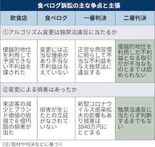訴訟は飲食店の評価点を算出する「アルゴリズム」(計算手法)の妥当性が初めて争点になったとされる。高裁判決はアルゴリズム変更について、独占禁止法違反には当たらないと判断した。原告の焼き肉・韓国料理チェーン「韓流村」(東京・港)側は最高裁に上告する方針。