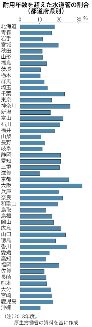 厚生労働省によると、水道管の事故は19年度、全国で約2万件報告された。水道管の法定耐用年数は40年。水道は高度経済成長期の1960~70年代に急速に普及し、多くが更新時期を迎えている。2018年度の総延長約72万キロのうち17.6%にあたる約13万キロが耐用年数を超えている。