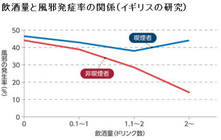 もしかして、酒が効いている、つまり「お酒を飲んでいると風邪をひきにくい」んじゃなかろうか…?