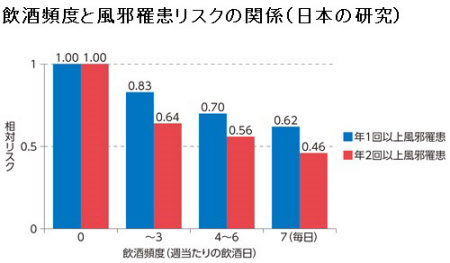 日本の研究では、飲む頻度が多いほど風邪をひきにくい結果に